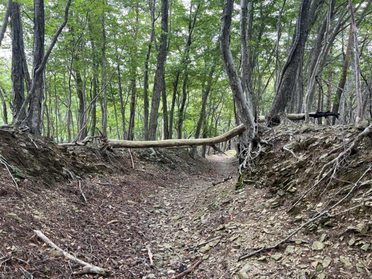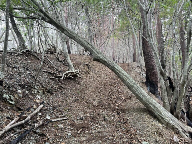 長年の落葉と土砂に堆積によって、トレイルが不明瞭な状態となっています。