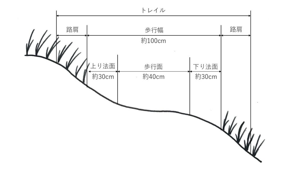 バッグパックを背負ったハイカー同士がすれ違うことができる最小限の幅であり、この幅を確保することによりトレイル外への踏み出しを防止します。