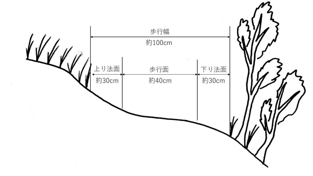 実際に行うとしたら、草刈りは歩行幅約100cmを基準とします(歩行面から左右30cm程度まで)。なお、谷側の路肩の植生は大きく育つように残します。ハイカーは谷側に寄り「下り法面」の路面を崩す傾向があるので、谷側の路肩の植生を大きくすることで、ハイカーをトレイル内に留め、植生とハイカーの安全を保ちます。