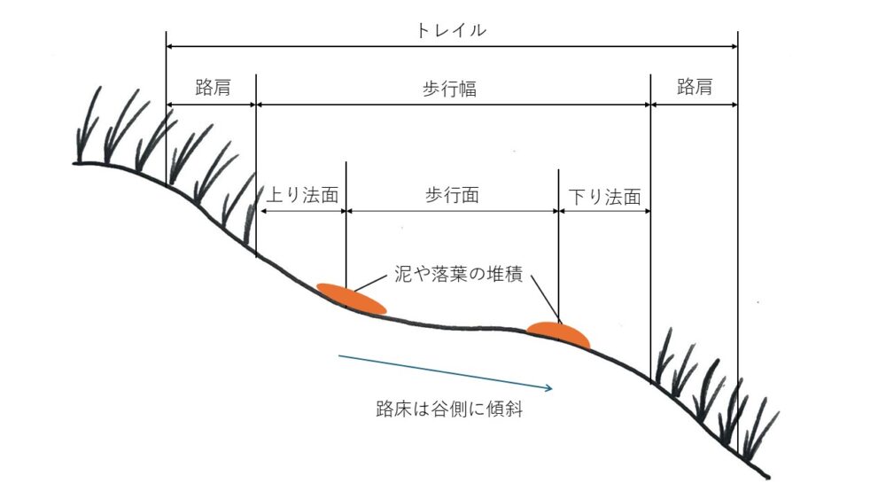 - 歩行面は少し谷側に傾斜させるように整地する(トレイルに流れ込んできた水を緩やかに流し浸食を防ぐ)
