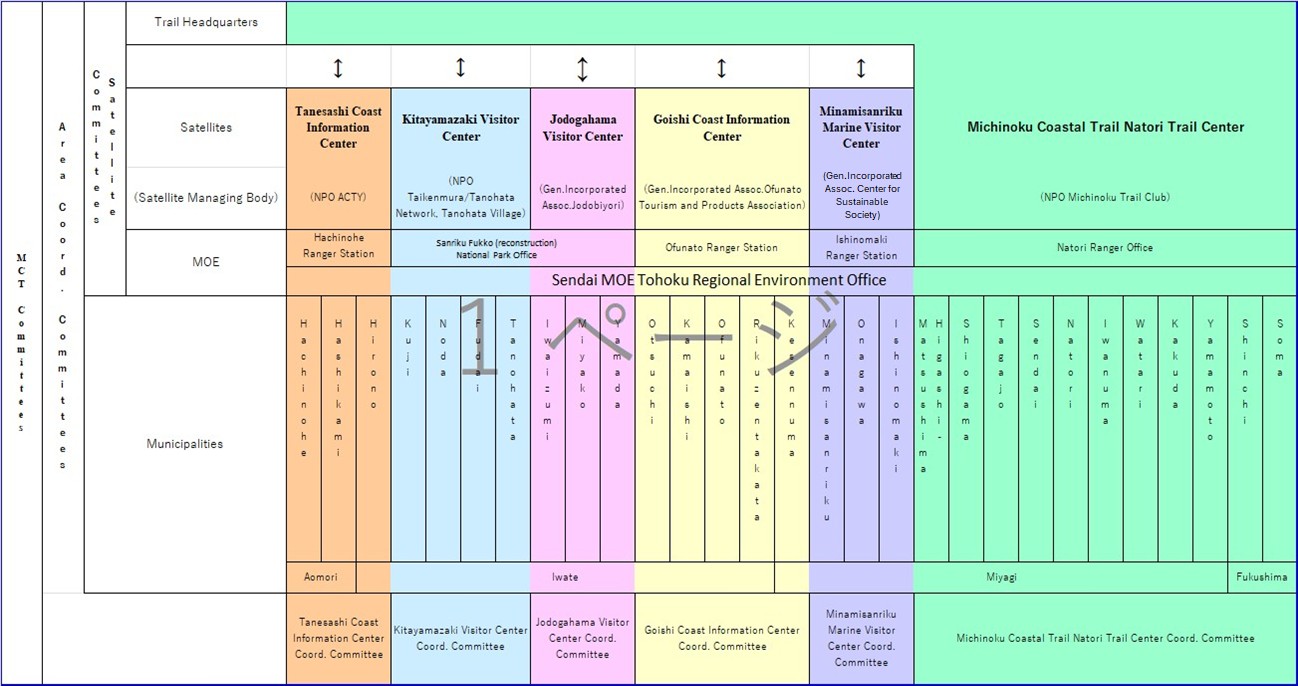 The Michinoku Coastal Trail’s management organization consists of the Ministry of the Environment, the local governments of the four prefectures and 29 municipalities along the trail course, the private organizations managing the six satellite facilities along the trail, as well as local people, groups and organizations. We are forming a system where a wide variety of members know and trust each other, collaborating to protect and develop this trail now and in the future.