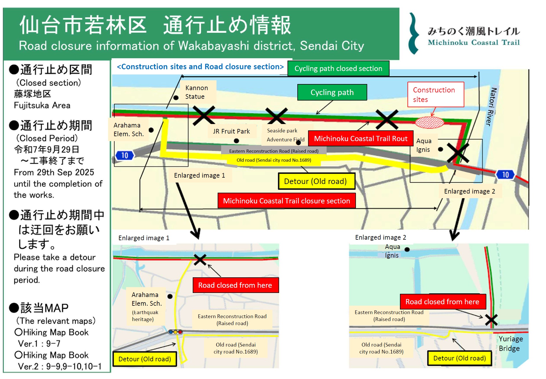 Due to construction work in the Fujitsuka area of Arahama in Sendai City, the main route of the Michinoku Coastal Trail will be closed to all passage starting September 29.