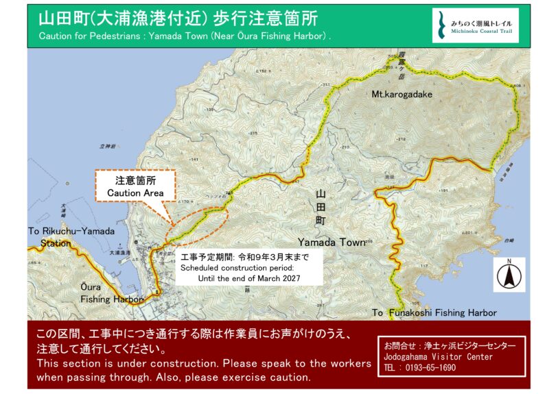Construction work is currently underway on the trail near Oura Fishing Port in Yamada Town. When passing through, please notify the site workers and proceed with caution for your safety.