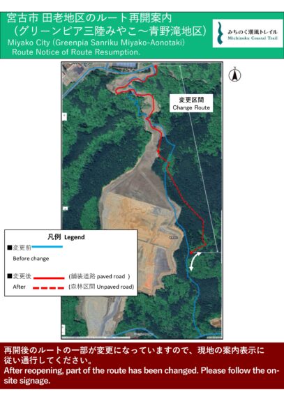 宮古市田老地区・グリーンピア三陸みやこから青野滝の間において、みちのく潮風トレイルの路線変更にともないGPSデータとオンラインマップを更新しました。