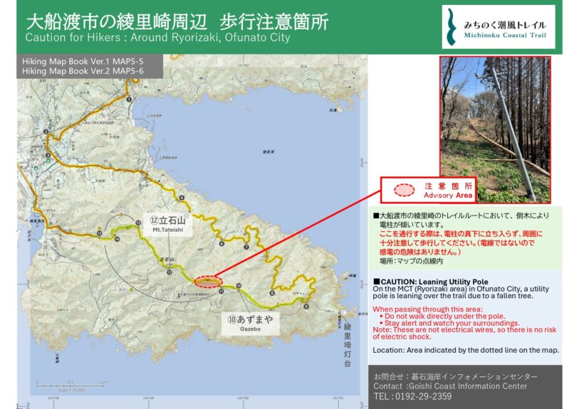 大船渡市の綾里崎のトレイルルートにおいて、 倒木により電柱が傾いています。ここを通行する際は、電柱の真下に立ち入らず、周囲に十分注意して歩行してください。(電線ではないので感電の危険はありません。)