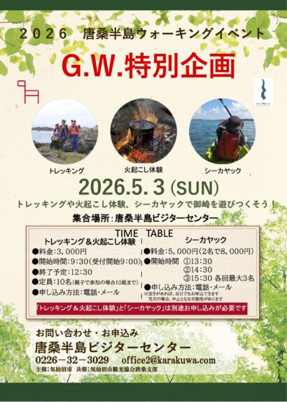 気仙沼市さんからイベント情報が届きました。詳細はこちらのリンクから気仙沼観光推進機構のホームページに飛び、詳細を確認できます。※お申込み方法も上記リンクからご確認ください。【お問い合わせ】唐桑半島ビジターセンター 電話番号:0226-32-3029 メ ー ル:office2@karakuwa.com
