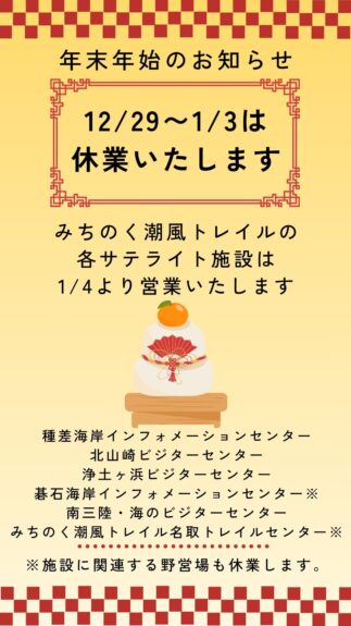 みちのく潮風トレイル沿線にある6つのサテライト施設では、2025年12月29日から翌2026年1月3日まで休業いたします。